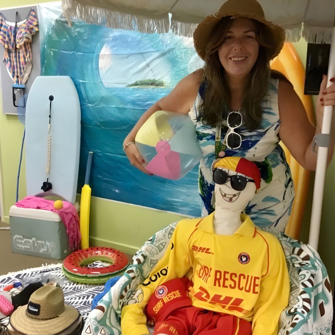 Windows were decorated with bright summer scenes, tables were dressed in beach‑themed cloths, and clients arrived in their favourite holiday outfits. Sensory touches, like the scent of sunscreen, sun hats, beach umbrellas and even a cheeky 'lifeguard' dummy brought the atmosphere to life and sparked plenty of laughter.