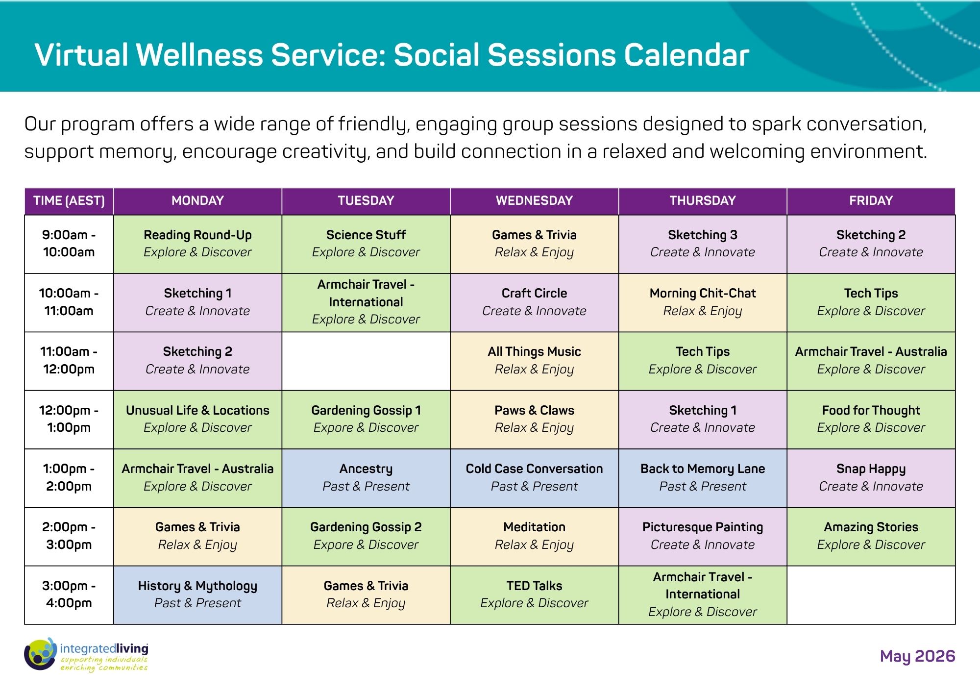 Here are all the sessions in a calendar starting in May 2026. We update our Social Sessions Calendar every six months so we offer more of what you want, and you can choose according to your interests and schedule.
